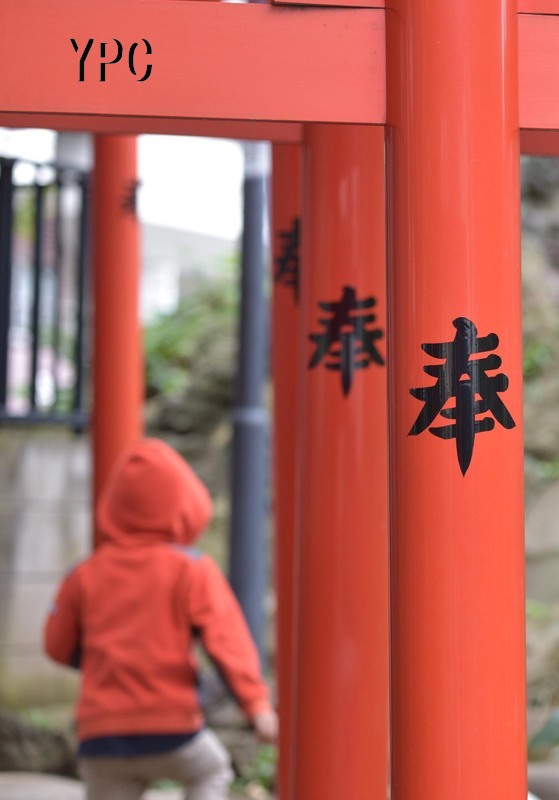 鳥居と同じ色をまとった少年。千駄ヶ谷の鳩森八幡神社前で