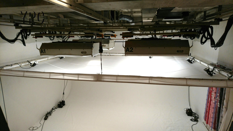 スタジオの天井に巨大な紗幕を張り、ストロボを4灯。スタジオでは「D枠+紗幕」という。