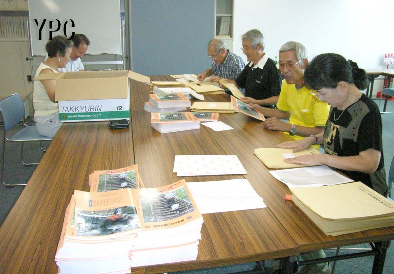 広報担当の事務局員、理事らが集まり行われたフレンズの発送作業(8月6日撮影)