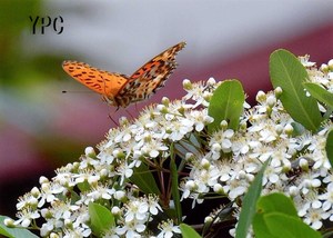 ピラカンサの花にチョウ