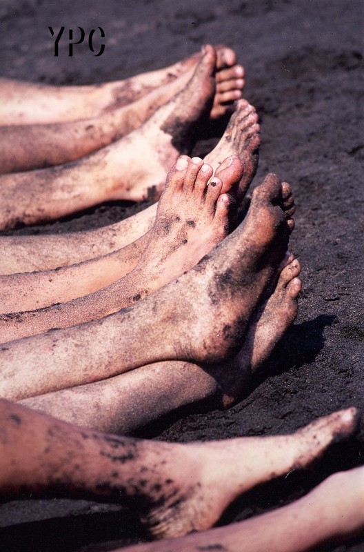 日光浴するはだしの少年