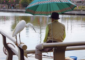 釣り人と鷺