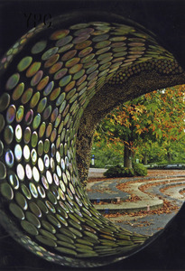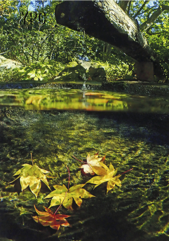 手水鉢の水中黄葉