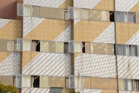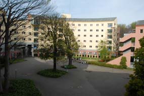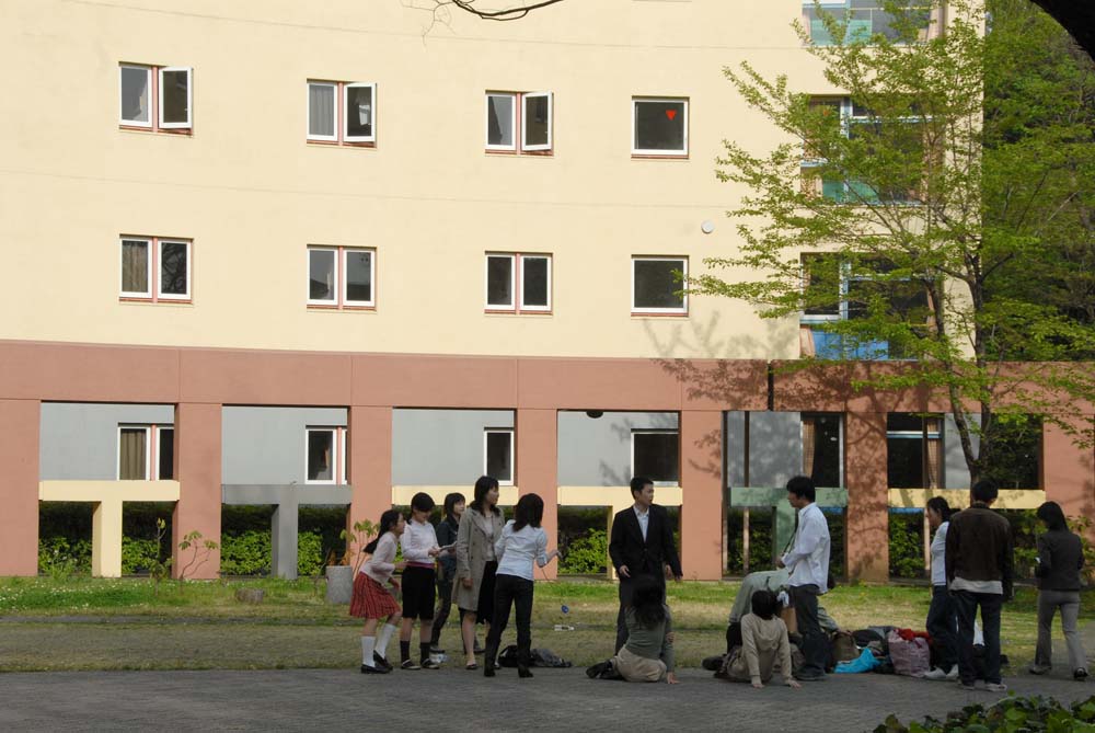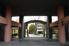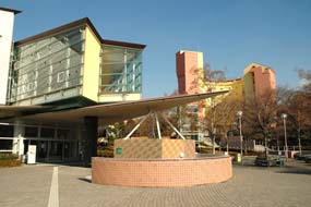 | センター棟前、オブジェのような芸術的な建物です。前の広場では子供が遊んでいたりします。 |